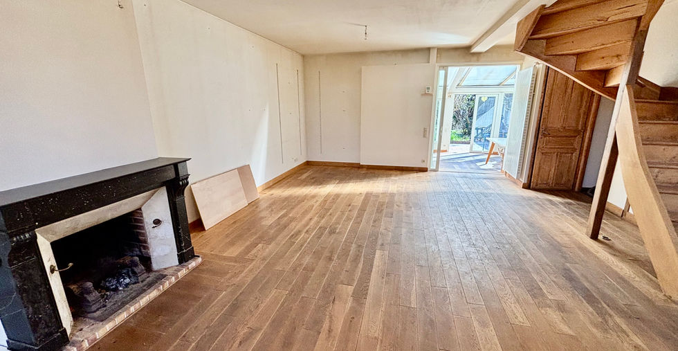 Au rez-de-chaussée : Spacieux salon / séjour avec cheminée fonctionnelle et parquet, offrant une atmosphère chaleureuse et conviviale.